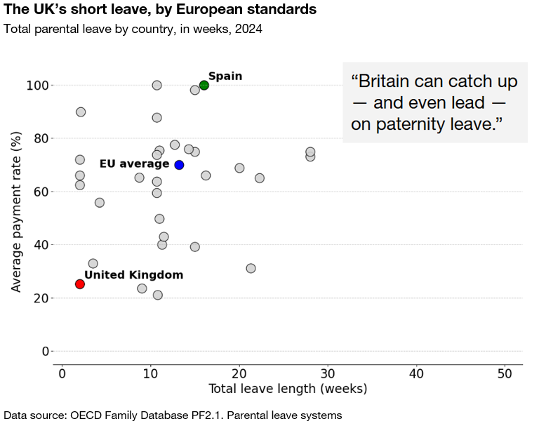 One immediate lesson worth repeating is that Britain risks falling further behind its peers if it doesn’t act decisively soon. While the UK still offers only two weeks at a statutory rate that is far below average wages, Spain has recently introduced 16 weeks of fully paid leave for fathers (Reuters, July, 2025). It is not surprising that uptake lags so badly. In fact, past government survey data shows that 35% of UK fathers who did not take leave cited affordability as the reason, compared with just 11% of mothers. The system as it stands is neither generous enough nor fair enough to encourage fathers to use it.